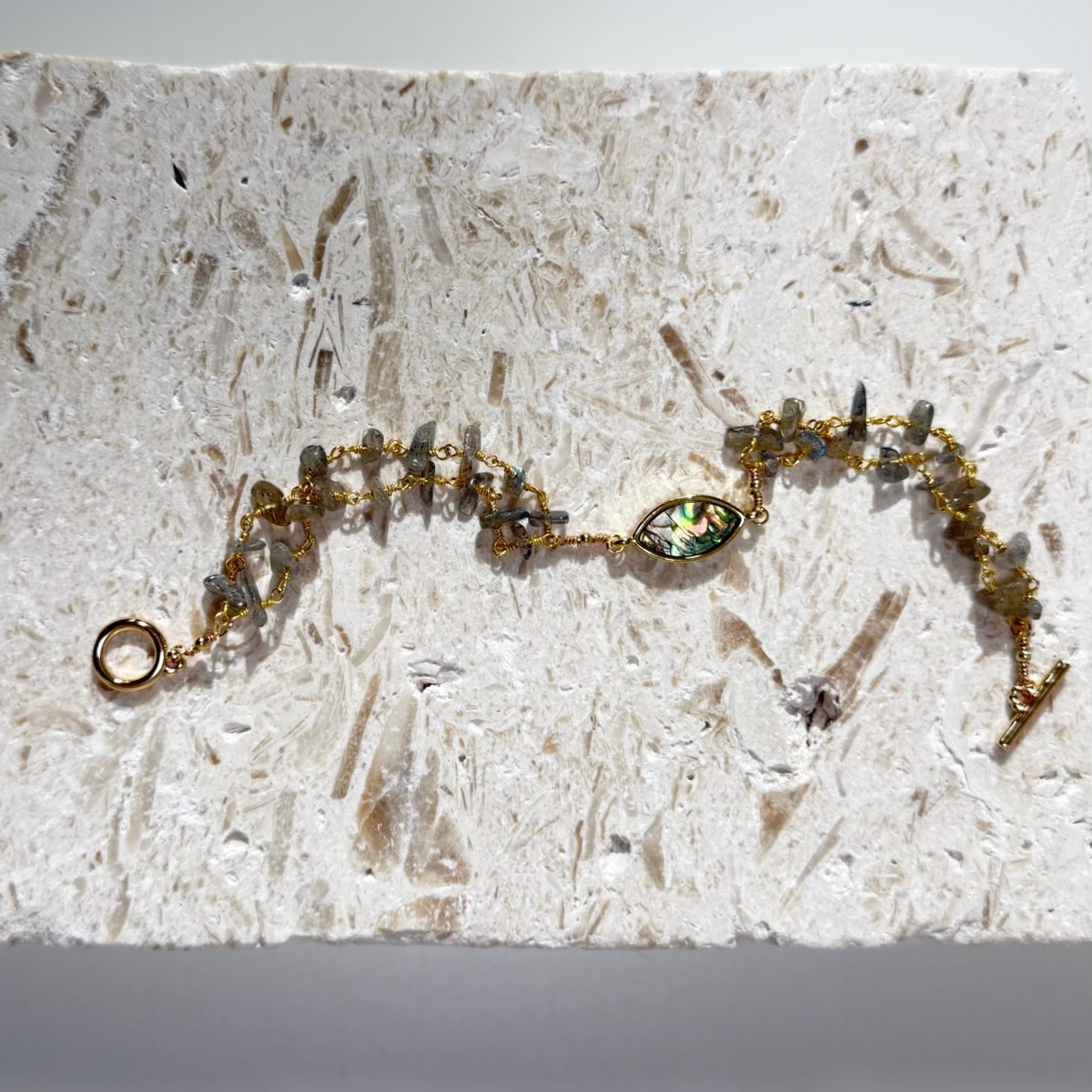 Finished with a 14k gold-filled toggle clasp, this bracelet wraps the wrist with quiet strength and beauty. Abalone is known to calm the mind and deepen intuition, while labradorite is often called the stone of transformation—together, they invite a sense of trust in change and peace in stillness.
