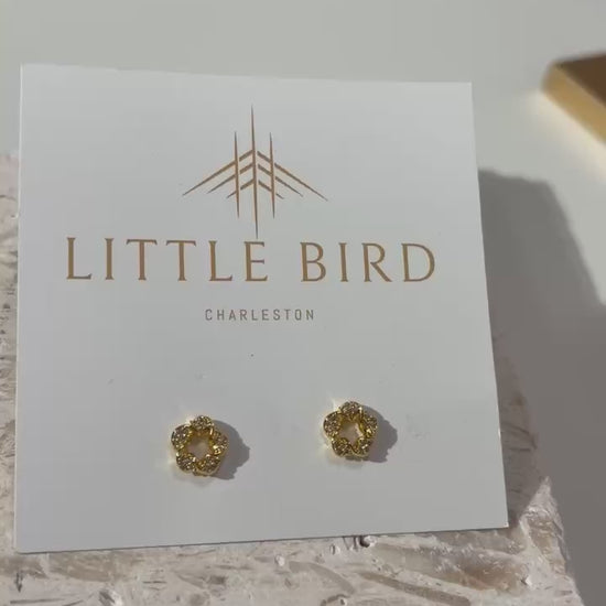 Like a bloom caught mid-whirl, the Solstice Bloom Studs capture nature’s soft motion in metal. An open circle unfurls into sculptural, petal-like curves—graceful and airy, kissed with glints of dew-like CZ stones. Whether dipped in warm 14k gold or cool silver, these dainty earrings shimmer gently with every turn of the head. Their lightweight form makes them a dream to wear daily, layered or alone—an understated nod to quiet beauty.