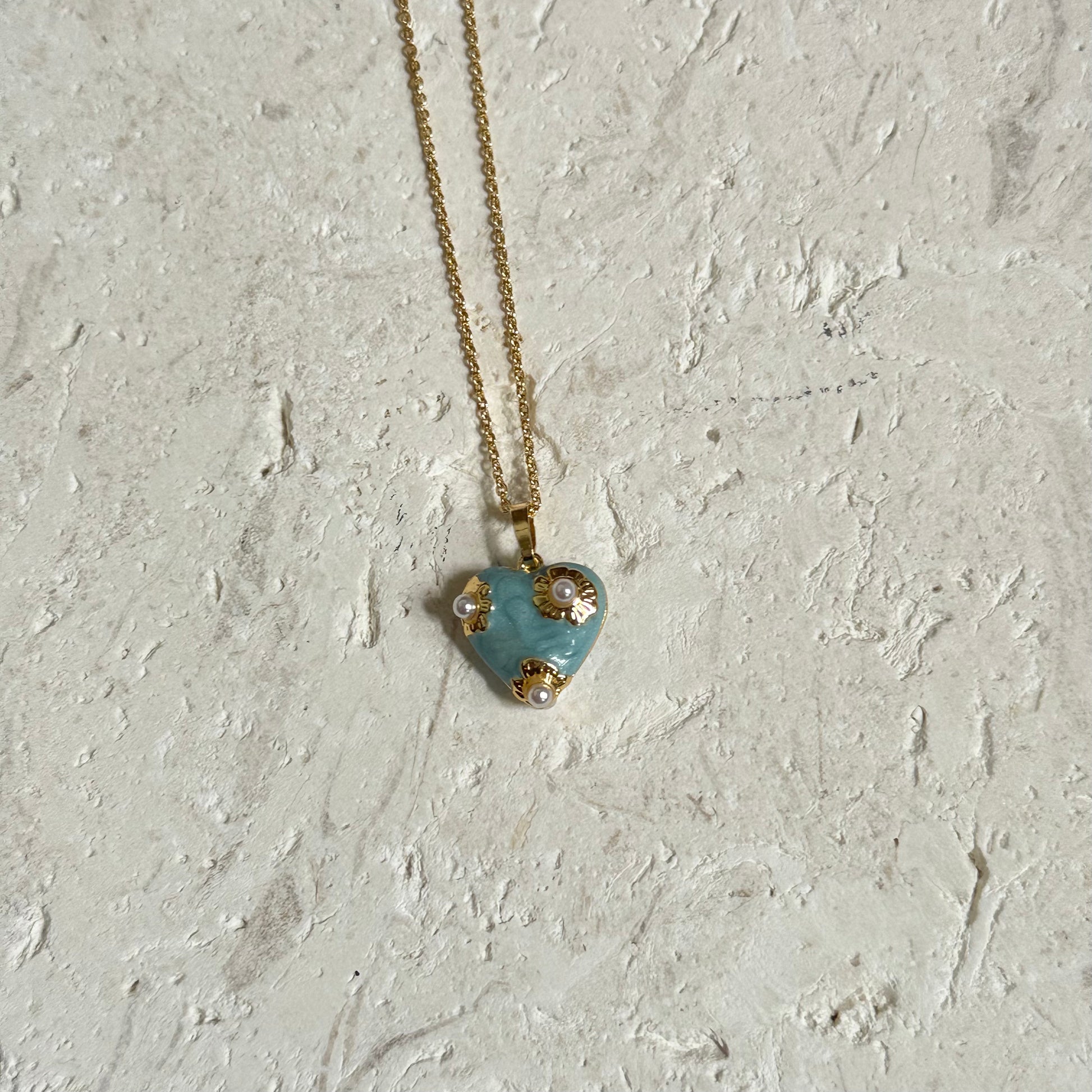 A heart full of softness, hued like twilight. The Bluebell Heart Necklace is a tender fall keepsake—centered around a deep blue heart charm adorned with tiny pearls and delicate gold floral accents, like petals pressed between pages.
