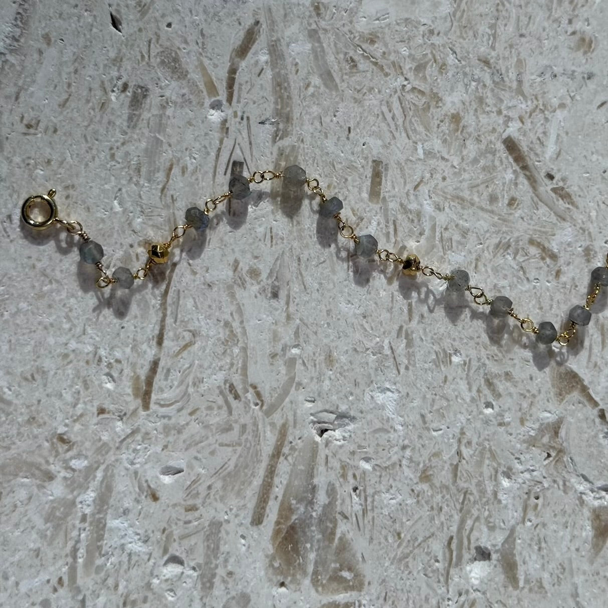 Labradorite catches the light with a subtle flash—cool grey with undertones of blue and green, like twilight skies or the edge of a storm. Gold pyrite adds a soft sparkle, reminiscent of candlelight or embers at rest. Together, they strike a balance between strength and softness, grounding and grace.