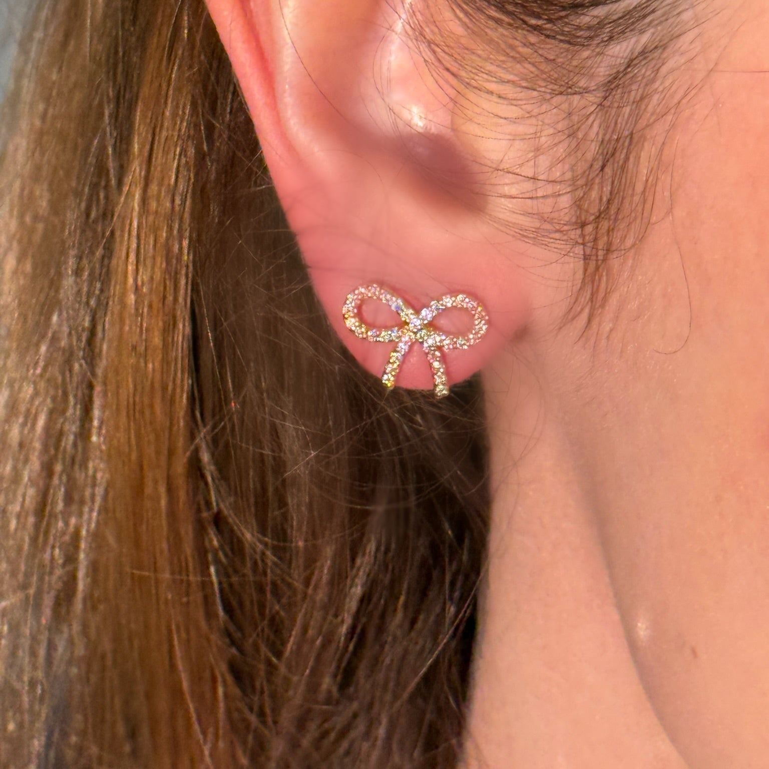 As sweet as a snowflake and just as light, the Frosted Ribbon Studs bring a soft shimmer to your winter days. Each dainty bow is lined with pavé-set cubic zirconia, tied into a delicate knot that sparkles gently—like frost catching first light.