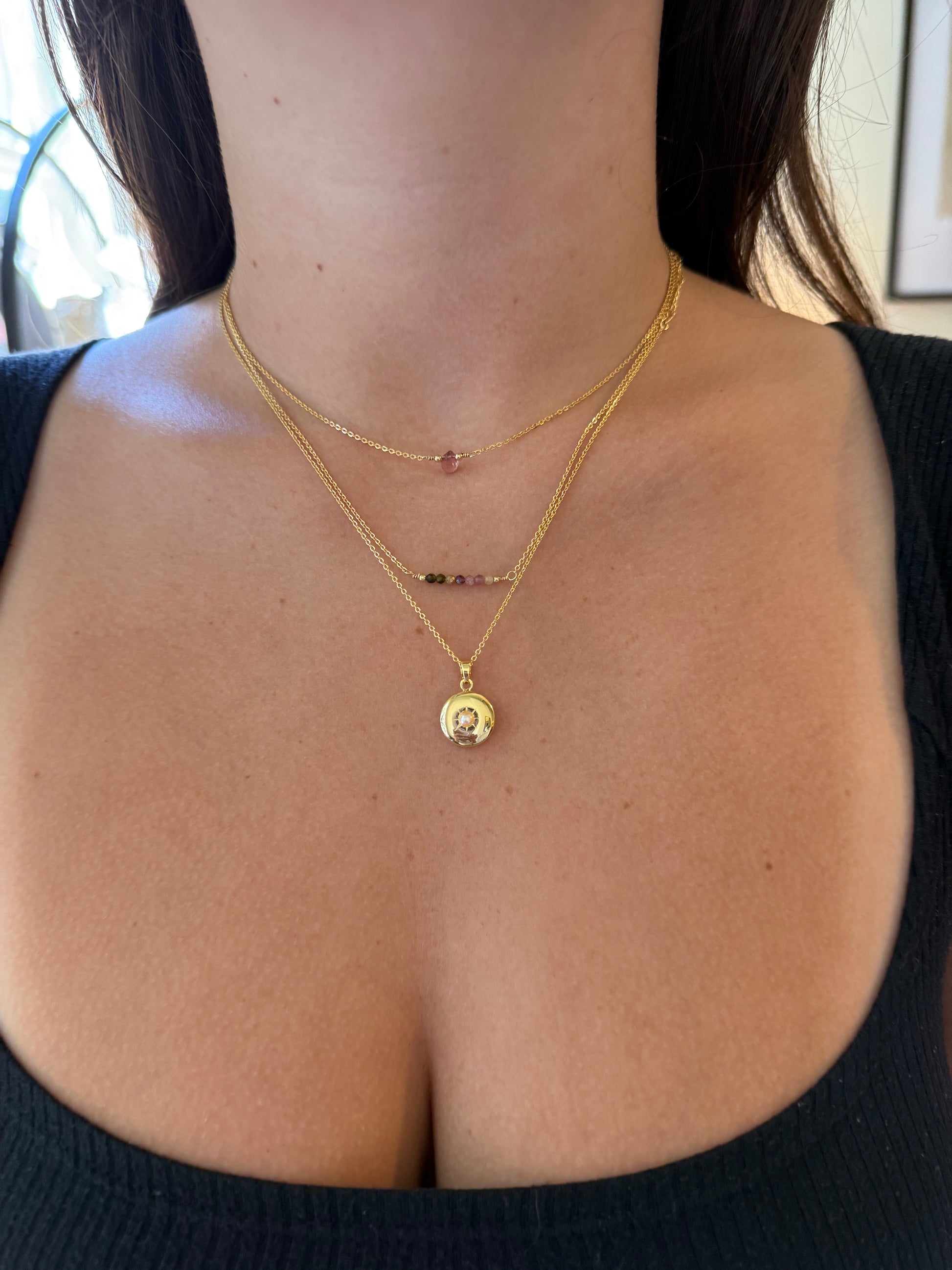 Set on a 14k gold fill chain with a 2-inch extender, this necklace sits just at the collarbone, making it ideal for layering or wearing close to the skin as a personal talisman.