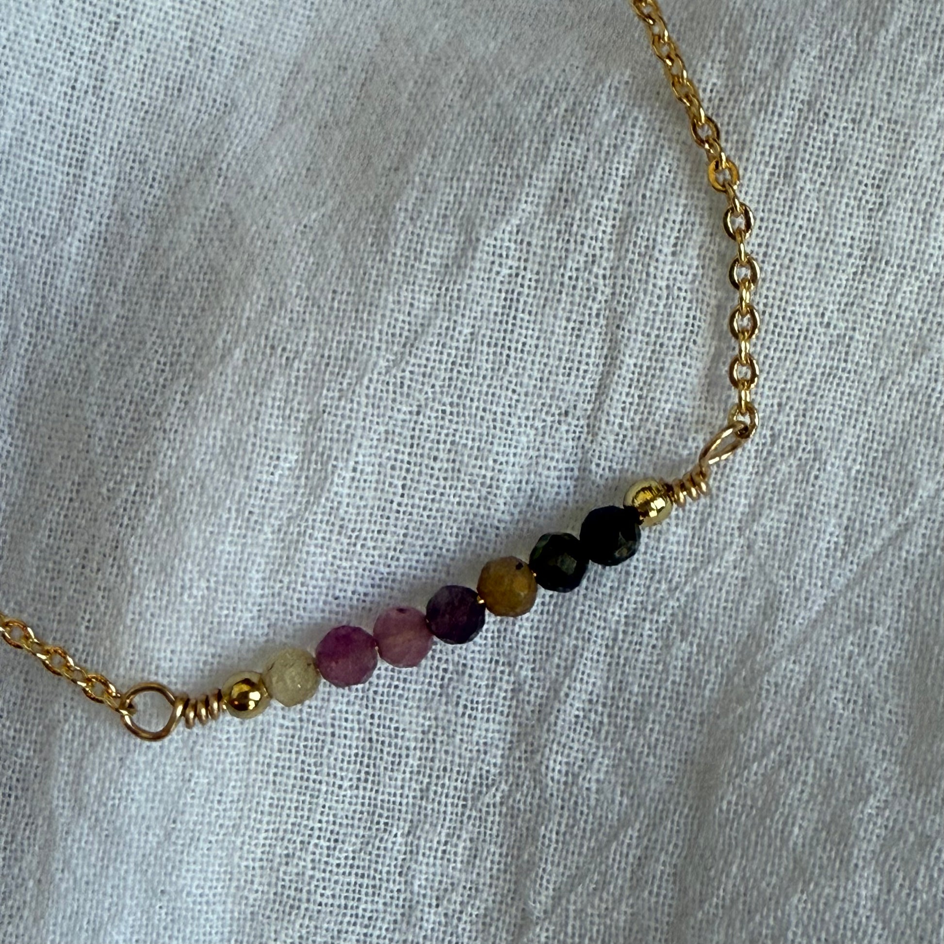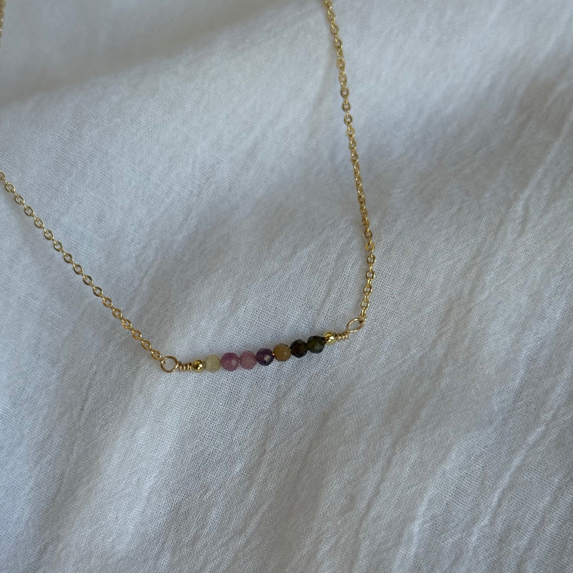 Seven tourmalines in a gradient sweep—from soft greens to rich rose—rest in a delicate golden bar. Each one is unique, just as no two autumns are ever the same. The effect is subtle, luminous, and grounded—an everyday kind of beauty that feels like a gentle ritual.