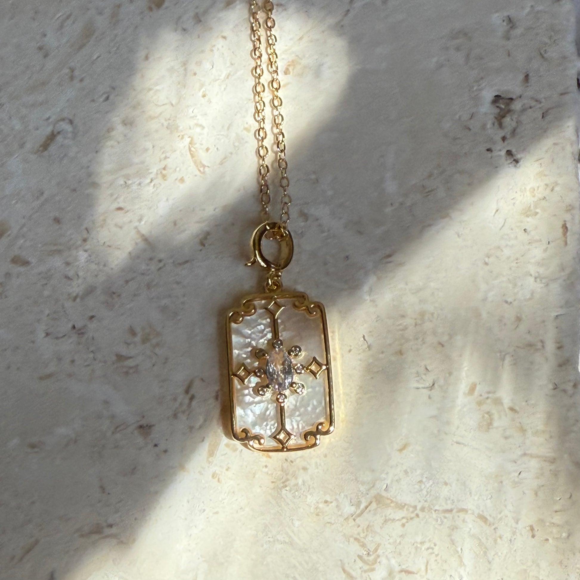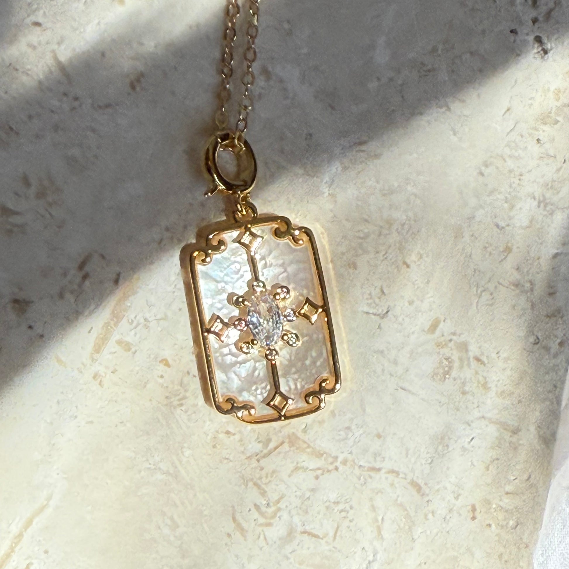 At its heart is a rectangular mother of pearl charm, delicately etched with a sunburst motif—like the first light breaking over calm water. Suspended from a 14k gold-filled chain, its soft luster and clean lines evoke a sense of quiet strength and clarity. The 16-inch length, with a 2-inch extender, makes it easy to layer or wear alone, sitting just at the collarbone.