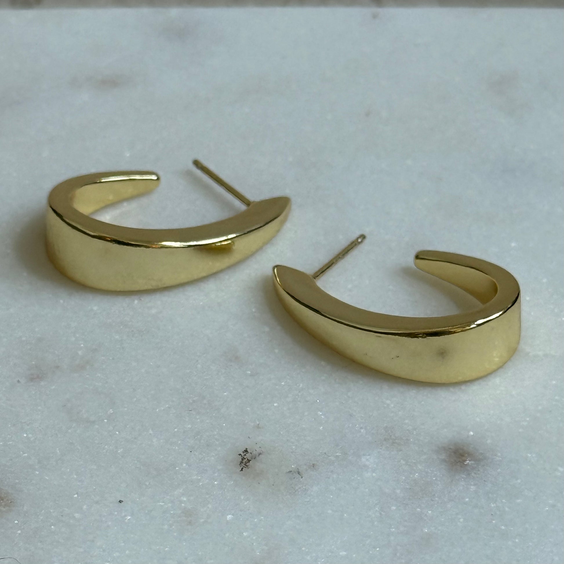 Strong lines, softened by light. The Harvest Arc Hoops are bold yet balanced—thick U-shaped studs that hug the ear with quiet confidence, polished to a golden glow that feels like autumn’s warmth held close.