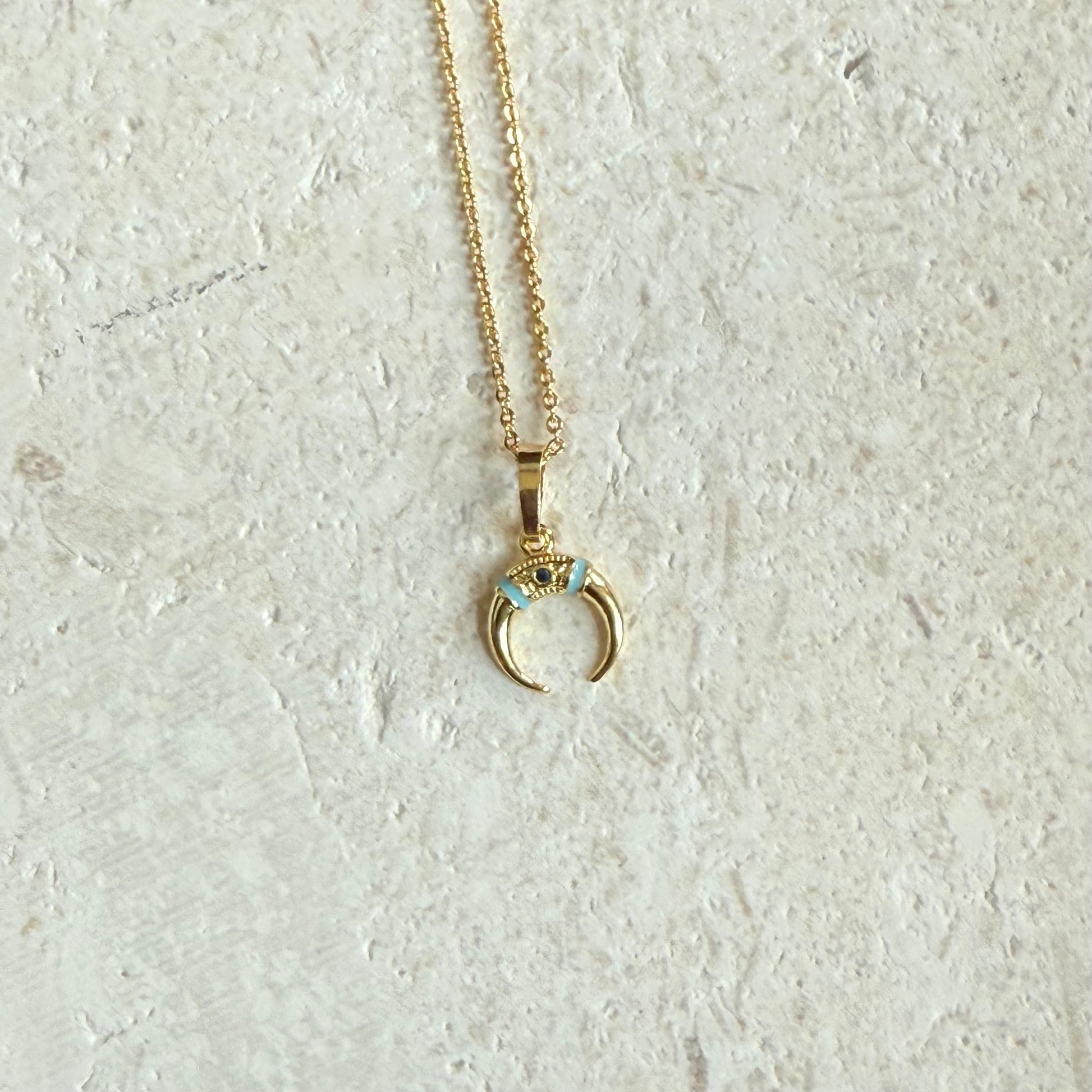 This piece features a small crescent horn charm, hand-enameled in a deep, moody blue that shifts subtly with the light. Set on a 14k gold fill chain with a 2-inch extender, it layers beautifully with other favorites or makes a quiet statement on its own.