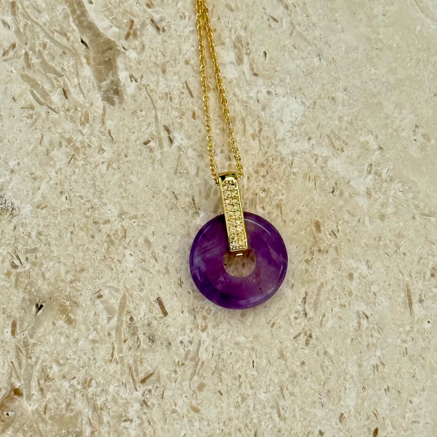 The Love’s Embrace Pendant features a donut-shaped amethyst, radiant in its quiet strength and laced with a subtle halo of pavé CZs—tiny glints of light that echo the spark between two hearts. Set in 14k gold fill and suspended from an 18-inch chain with a 2-inch extender, it rests near the heart like a vow kept close.