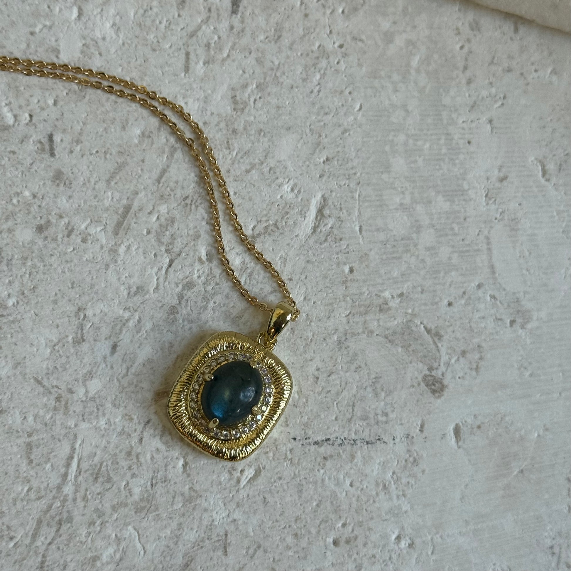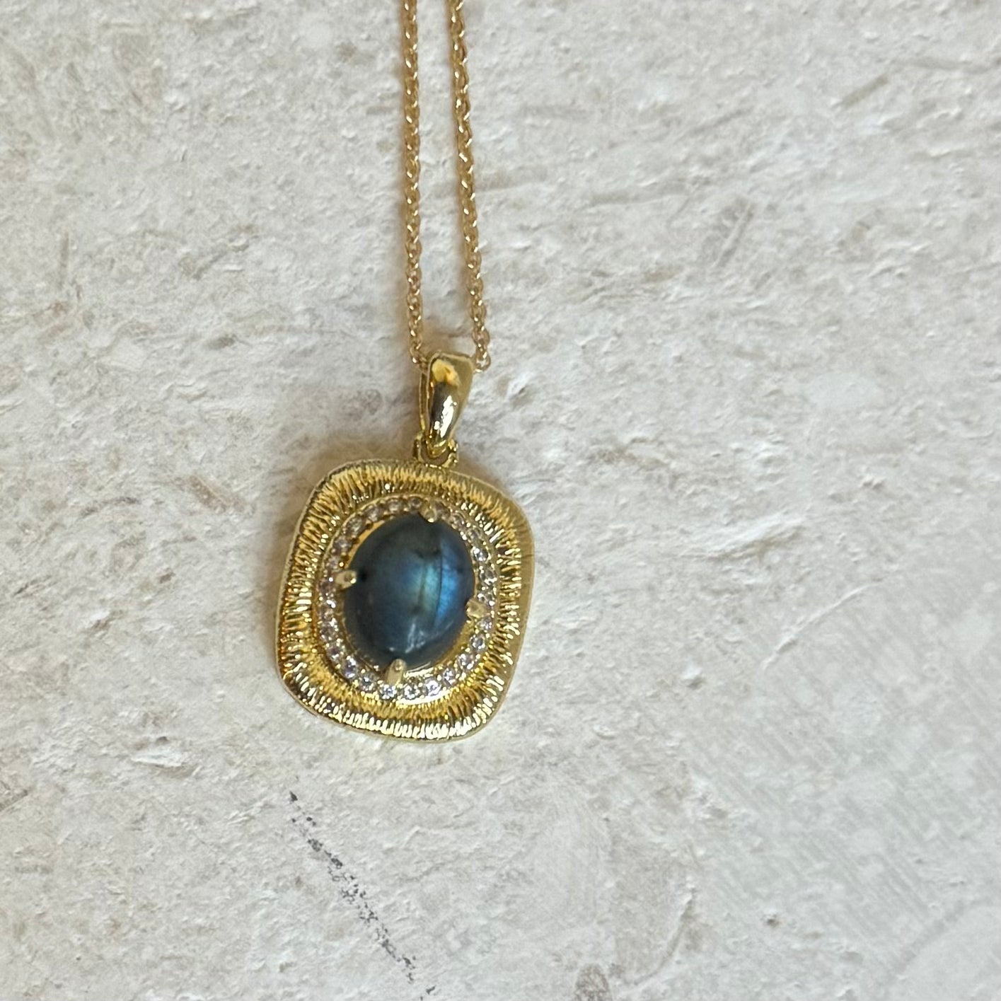 There’s a quiet kind of magic in the Moonveil Pendant. A flash of iridescent labradorite—softly framed by a halo of pavé crystals—seems to hold a secret, catching light like a tide catches moonlight.