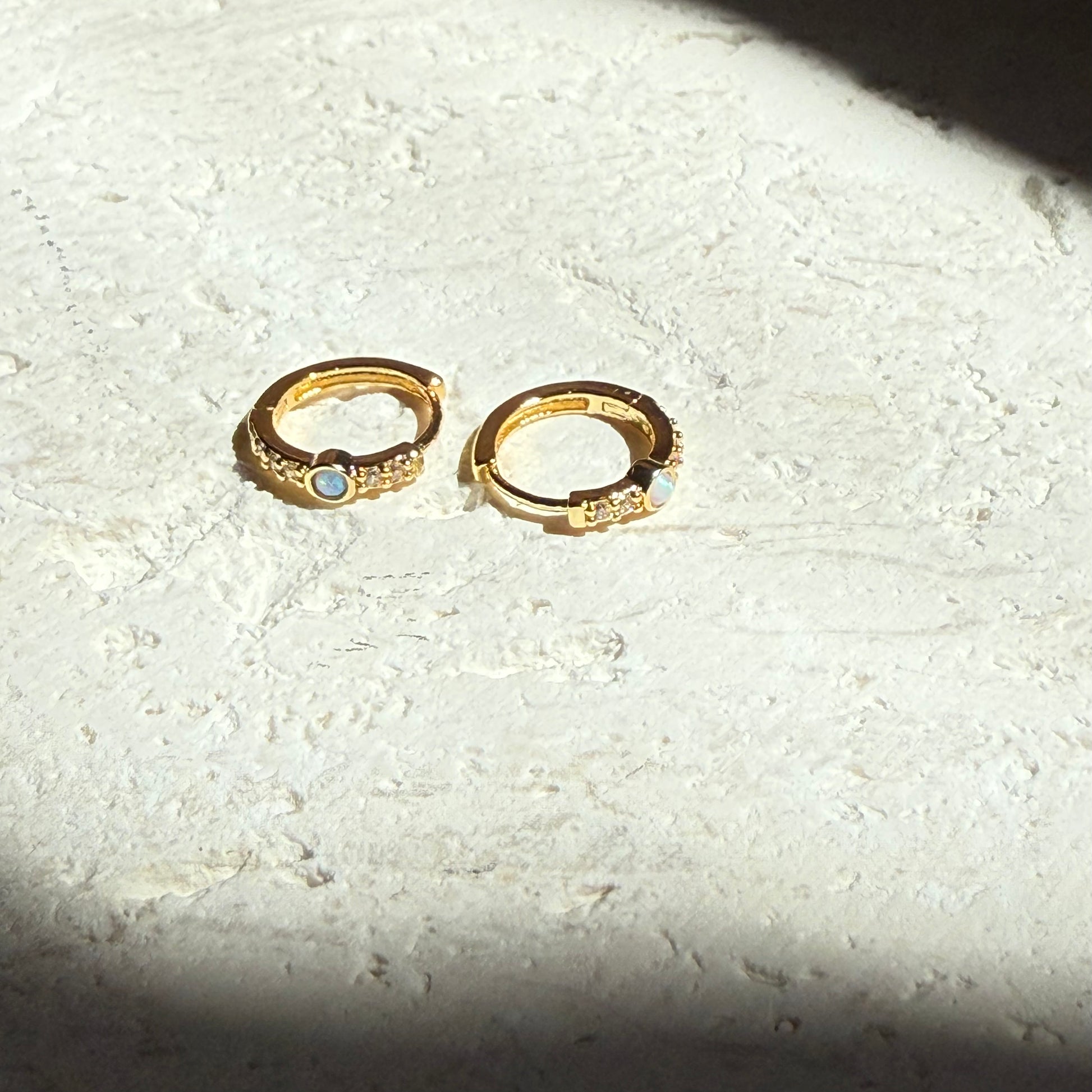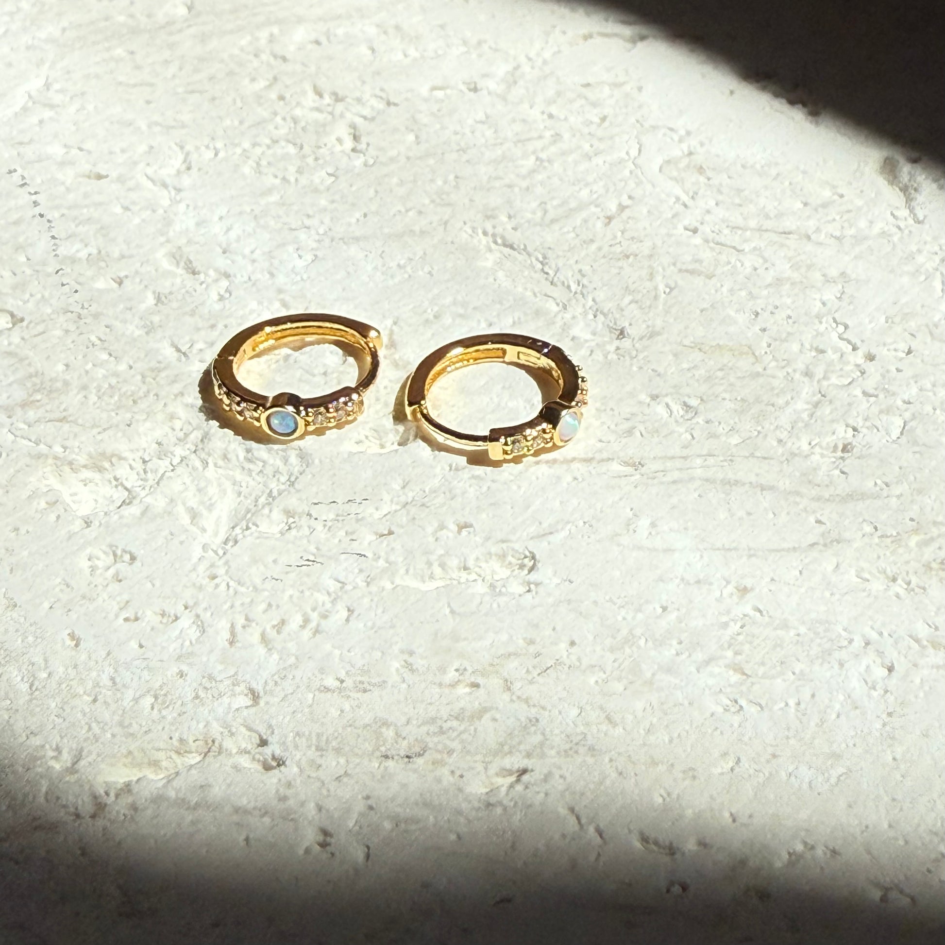 Hand-finished in small batches, each pair reflects the care of its making. We’ve chosen CZ crystals for their clarity and enduring shine, and opals for their dreamlike play of color—an echo of ocean light and shifting skies. Every hoop is crafted to sit just right, offering a snug yet comfortable fit for all-day wear.