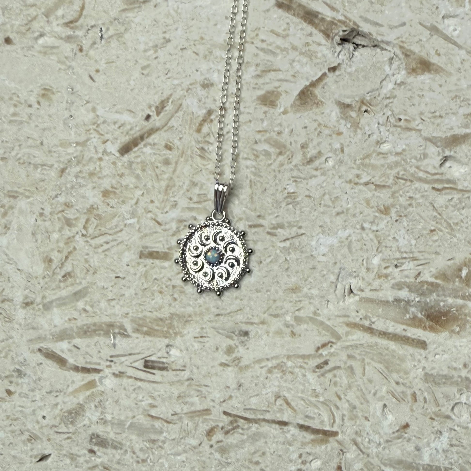 In the quiet hush of winter, the moon feels closer—clearer. A guide through long nights and new beginnings. The Solstice Moon Necklace reflects that soft, powerful pull: a silver rhodium coin charm etched with lunar phases, anchored by a glowing opal center. Strung on a 16-inch sterling silver chain, it sits just at the collarbone, like a whisper of light.